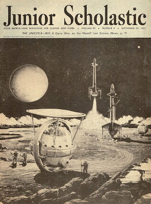 Its a new year and a new revelation from the land of the surprising sun. Blogmeister Terry has supplied this really obscure Imai kit, the Discoverer. Its been sold at auction in Japan as a made up kit, but sadly missing the large dish antenna array on the top. Still, its a really weird uniwheel concept. You can see that the idea was seriosly considered at some point in the early space race as illustrated by this issue of Junior Scholastic from 1961 shows. The image is courtesy of John Sissons glorious 'Dreams of Space' blog.