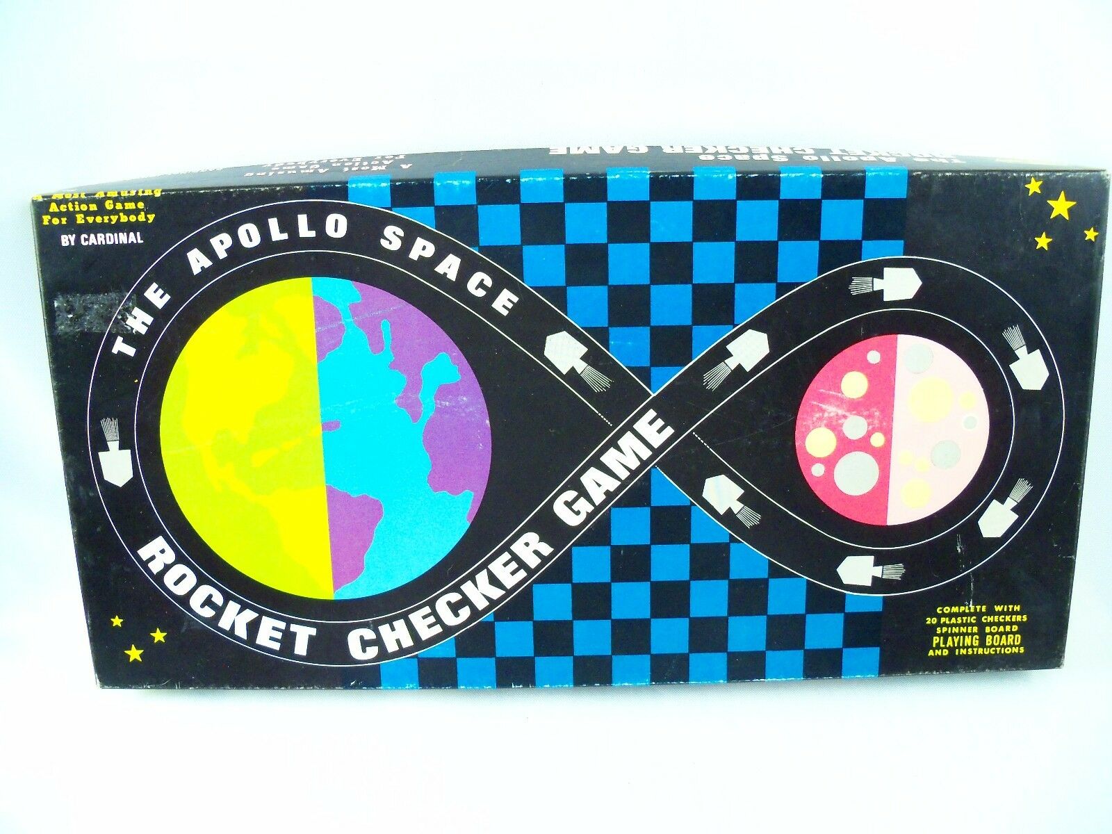 This game I saw on auction ages ago is not one I know. The Apollo Space Rocket Checker Game by Cardinal.