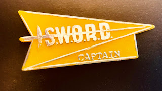Another cool badge I have come across, which is clearly reminiscent of the Sword line, is this plastic Astronaut badge. Its gold foil embossed and has the usual safety pin fastener, but I have no idea who made it.