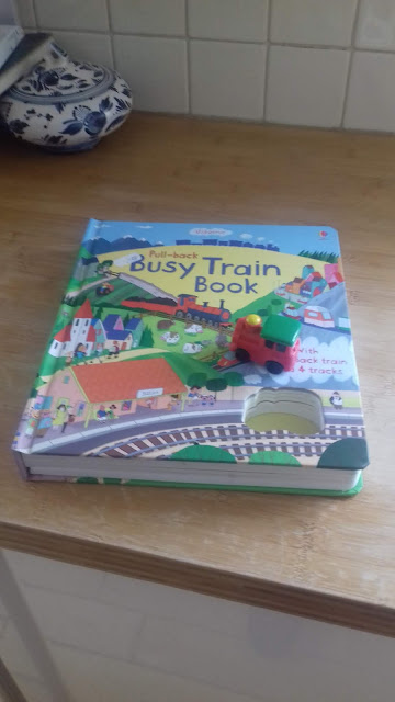 A terrific idea, a pull-back toy train goes whizzing round different tracks in a book!
