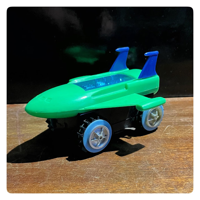 The UFO vehicle, was originally misidentified from the box art as a SWORD Moonbus, due to the dome and the rear fins, but in actuality, it is a small flying saucer sat on the front of a finned rear unit. The blue dome is empty, so for the photographs, I included a chrome radar dish. In the front cockpit is a silver astronaut, every inch like the Apollo Moon Exploring pilots.