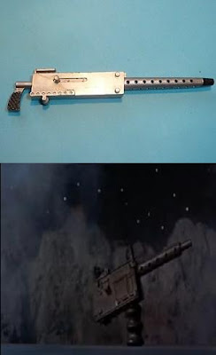 When the MEV is trundling round Mars and fighting rock snakes it deploys a machine gun from it's roof [bottom]. As soon as I saw it I thought of the Action Man machine gun I had as a kid [top]. Comparing the two there are some similarities but they're not the same. Presumably the movie gun was made by the prop department.